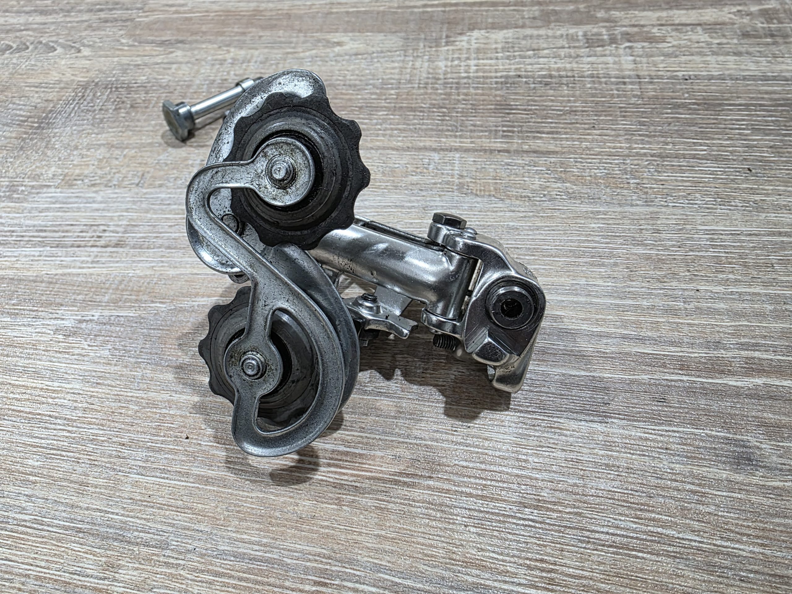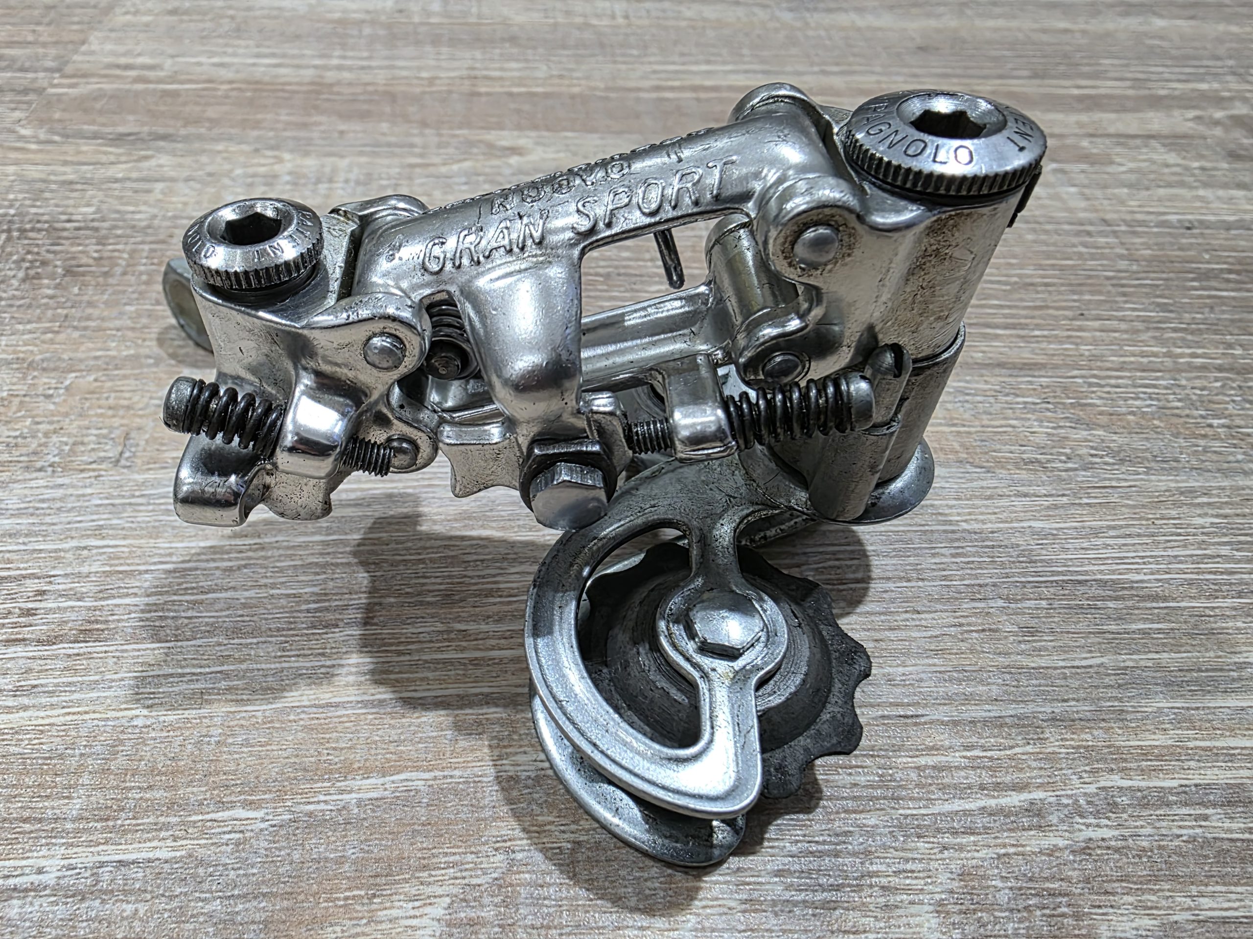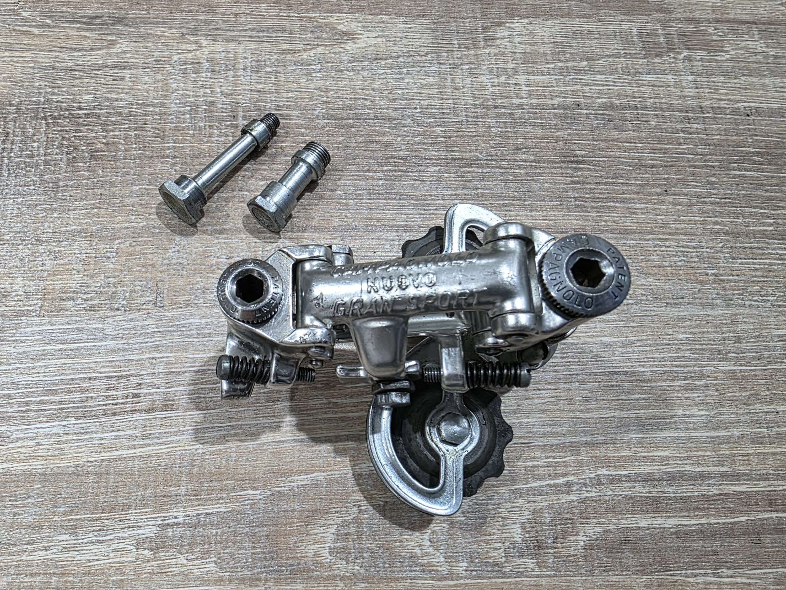 Zu verkaufen ist ein gut erhaltenes Campagnolo Nuovo Gran Sport Schaltwerk. Die beiden großen Schrauben habe ich gegen welche aus der Nuovo Record ausgetauscht, weil diese einfach schöner aussehen!