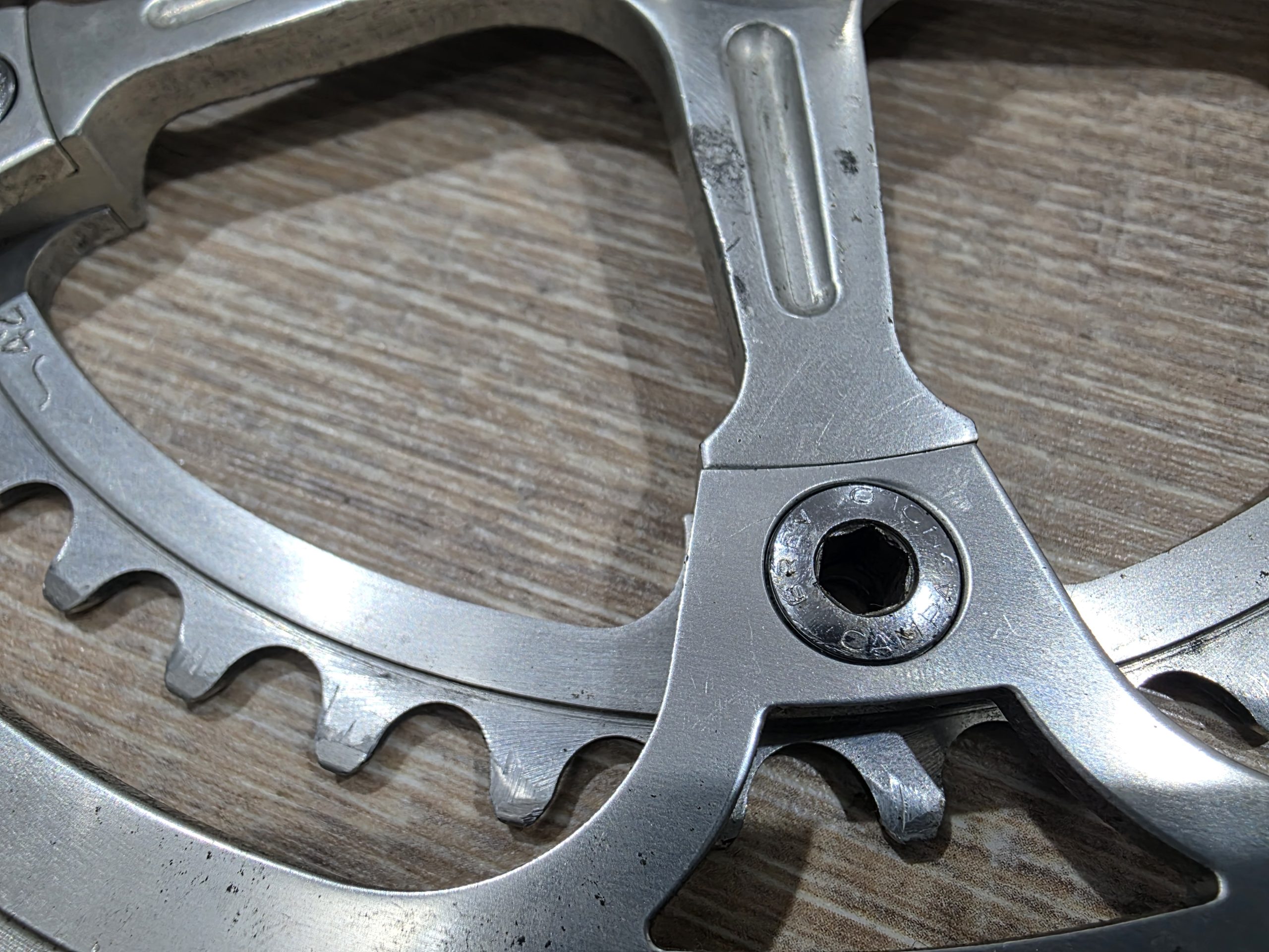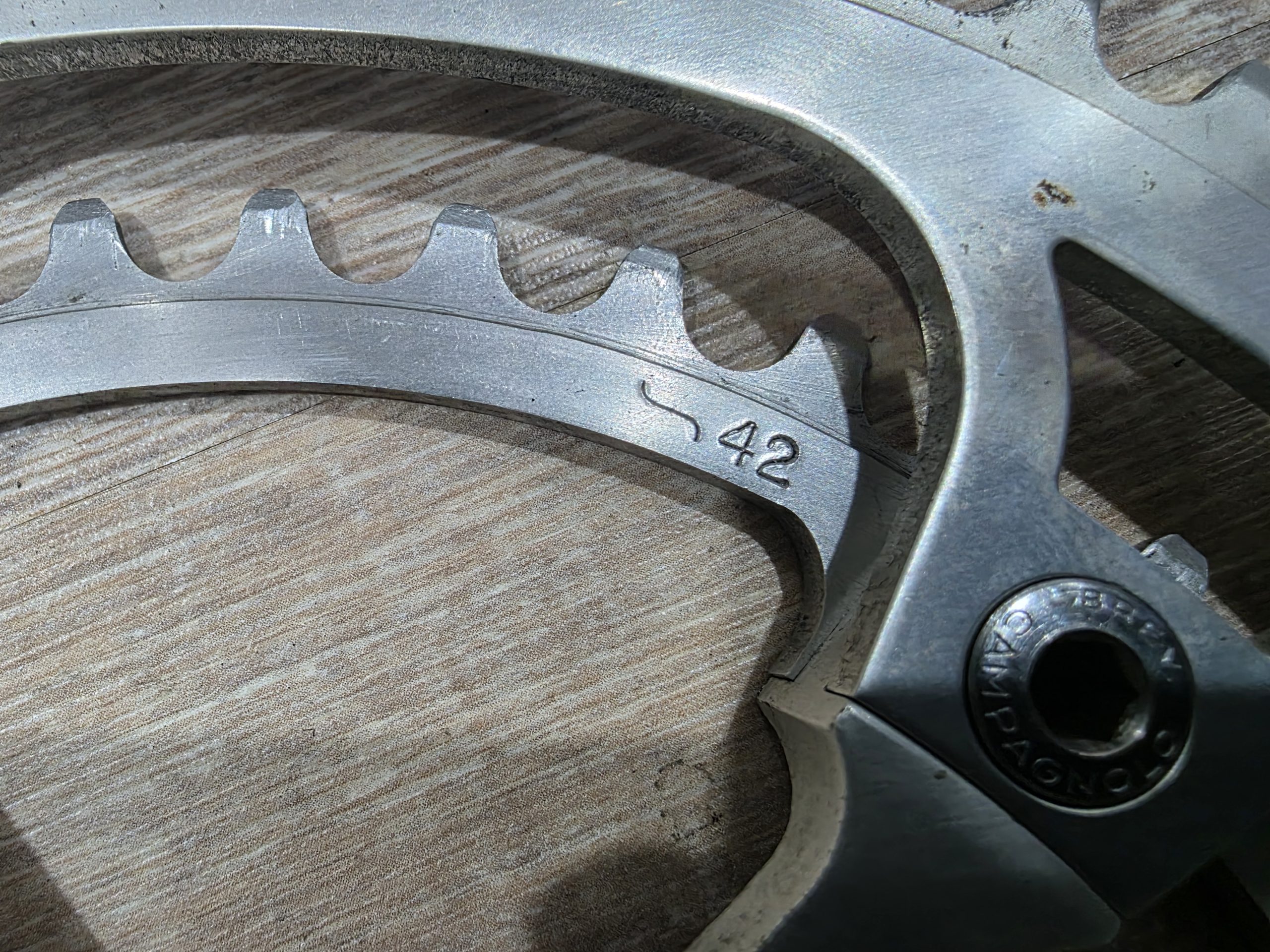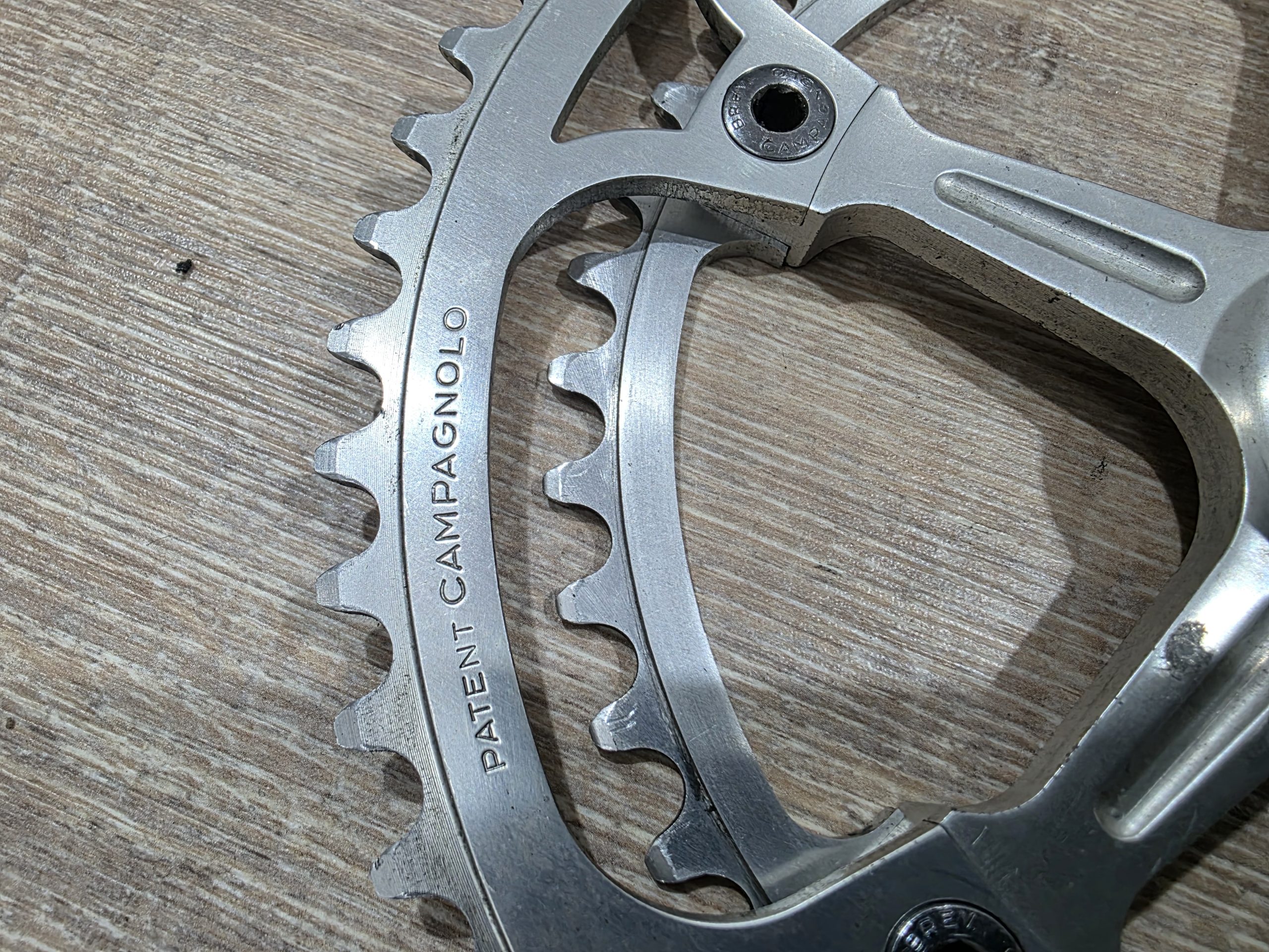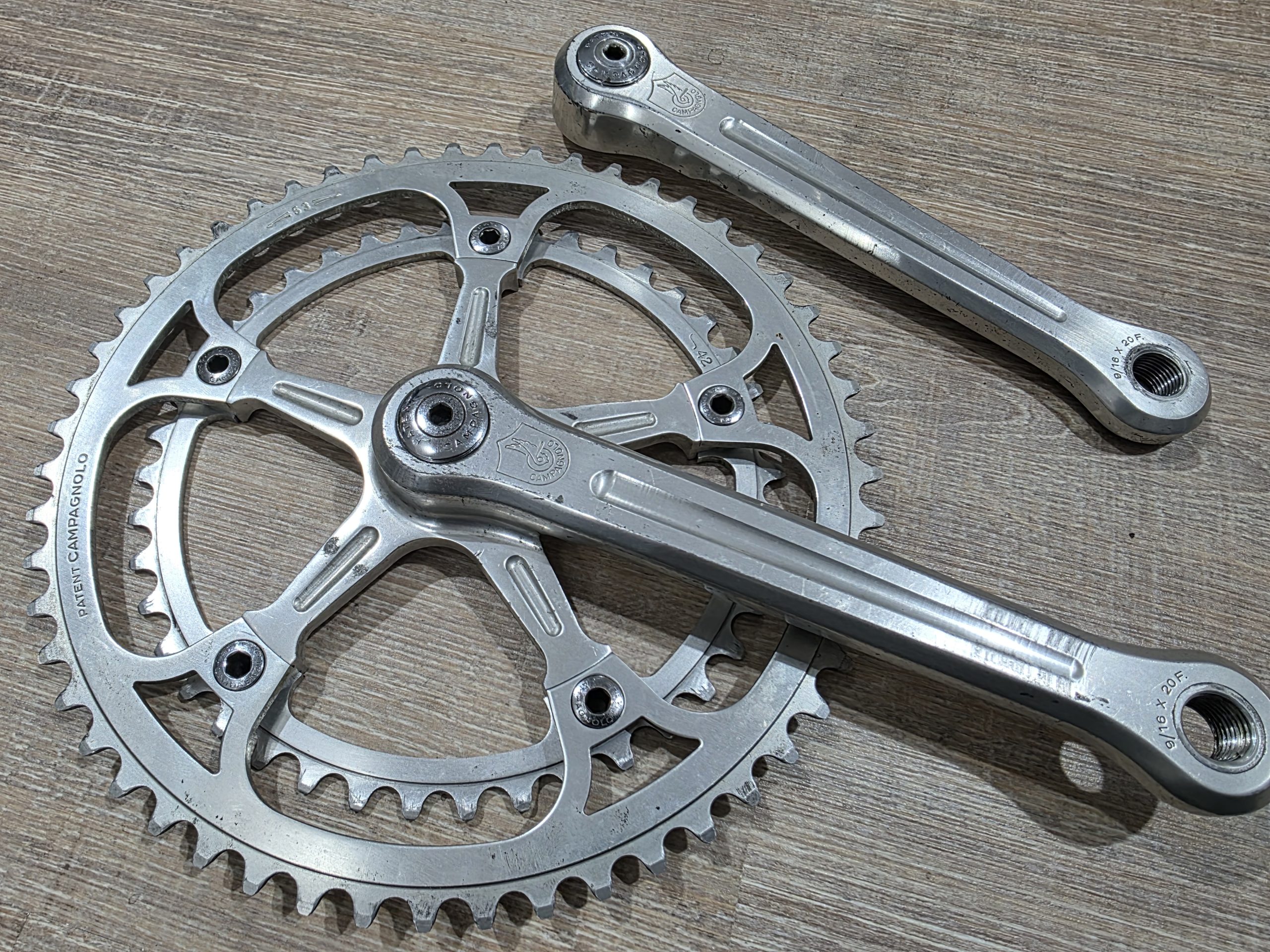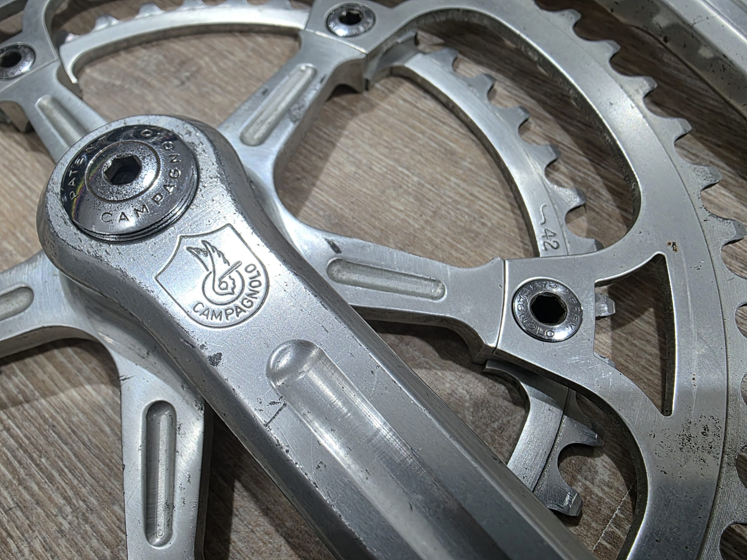 Zu verkaufen ist eine Campagnolo Super Record Kurbel mit einer Länge von 175 mm. Die Kurbel ist komplett mit Schrauben und original Staubkappen. Die Kettenblattschrauben sind auch original Campagnolo.
