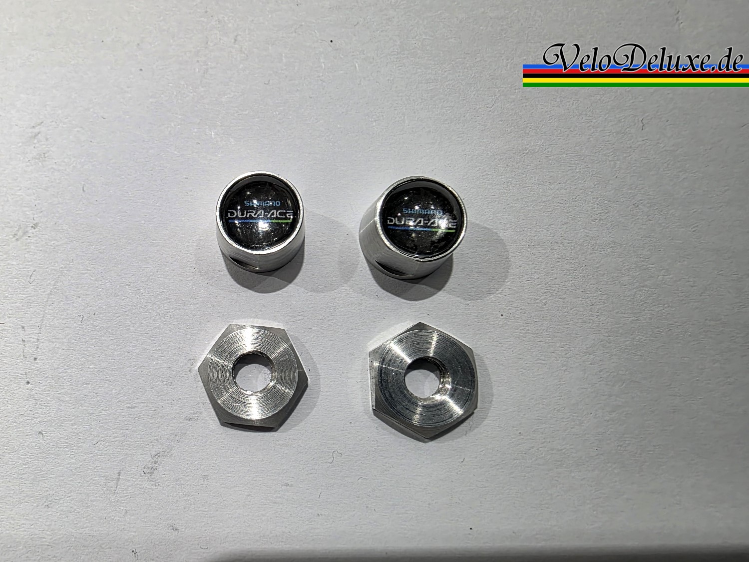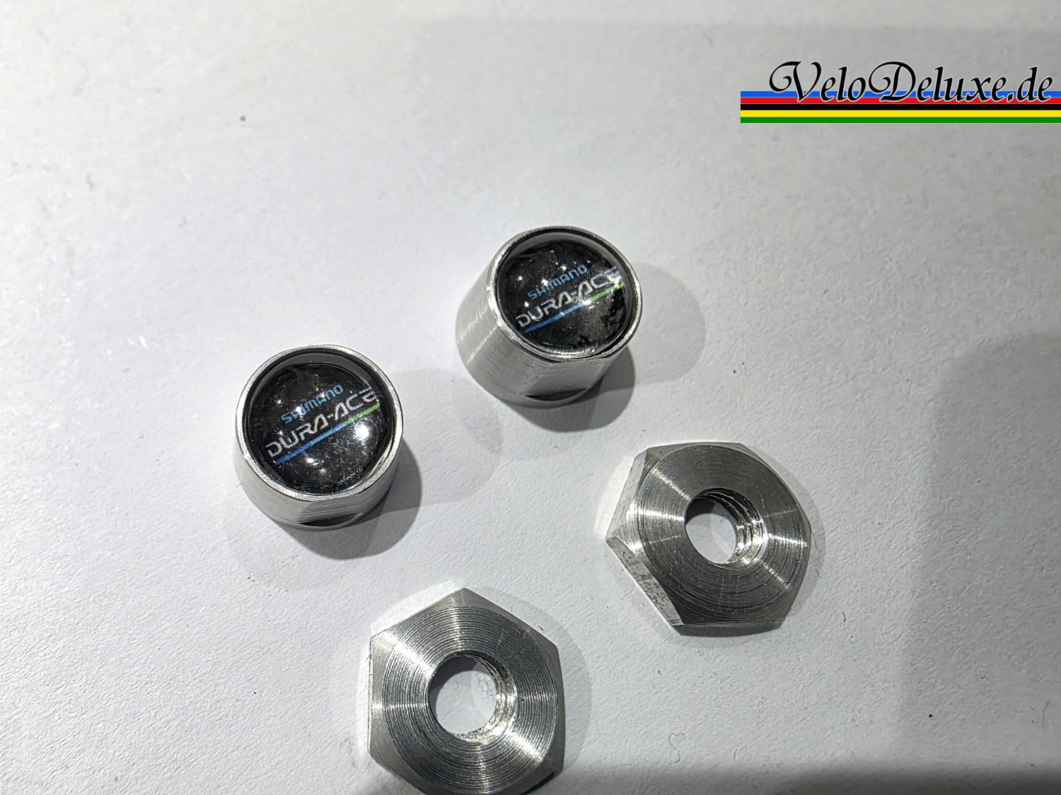 Die Muttern sind aus leichtem Aluminium gefertigt und haben das Logo hinter einem Glaseinsatz.