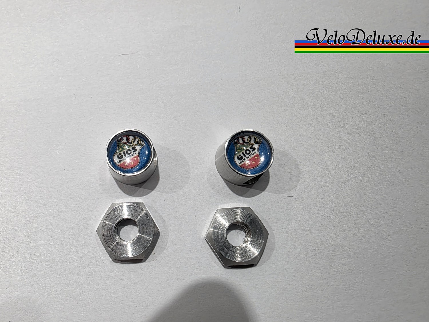 Die Muttern sind aus leichtem Aluminium gefertigt und haben das Logo hinter einem Glaseinsatz.