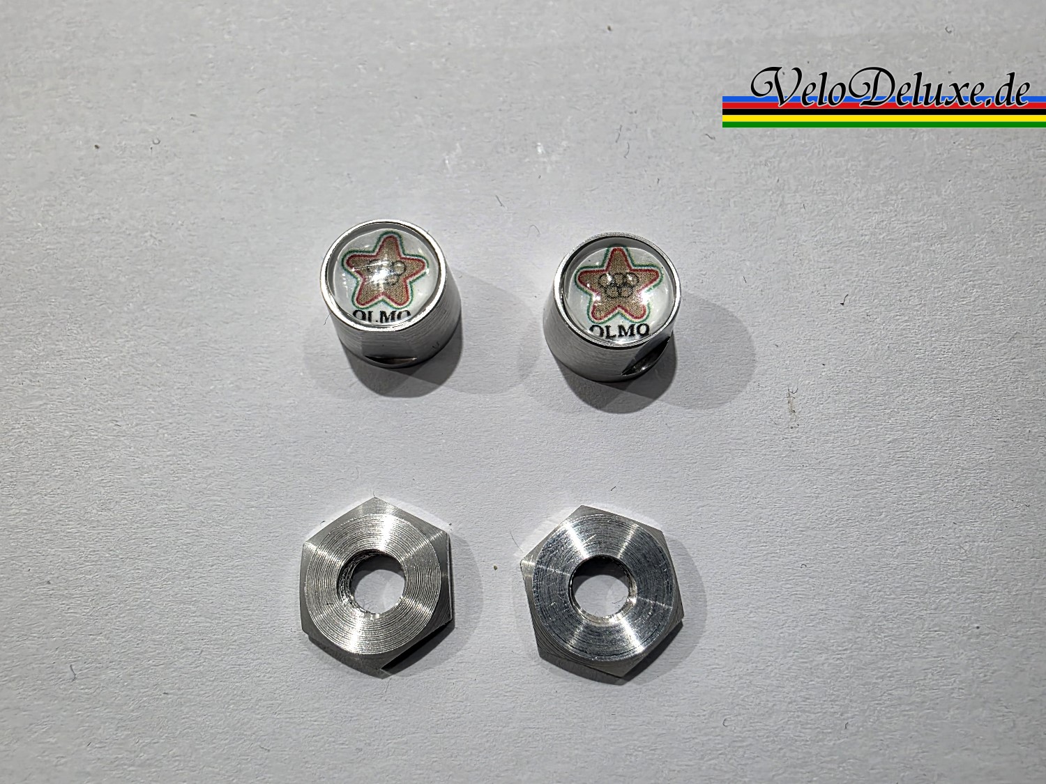 Die Muttern sind aus leichtem Aluminium gefertigt und haben das Logo hinter einem Glaseinsatz.