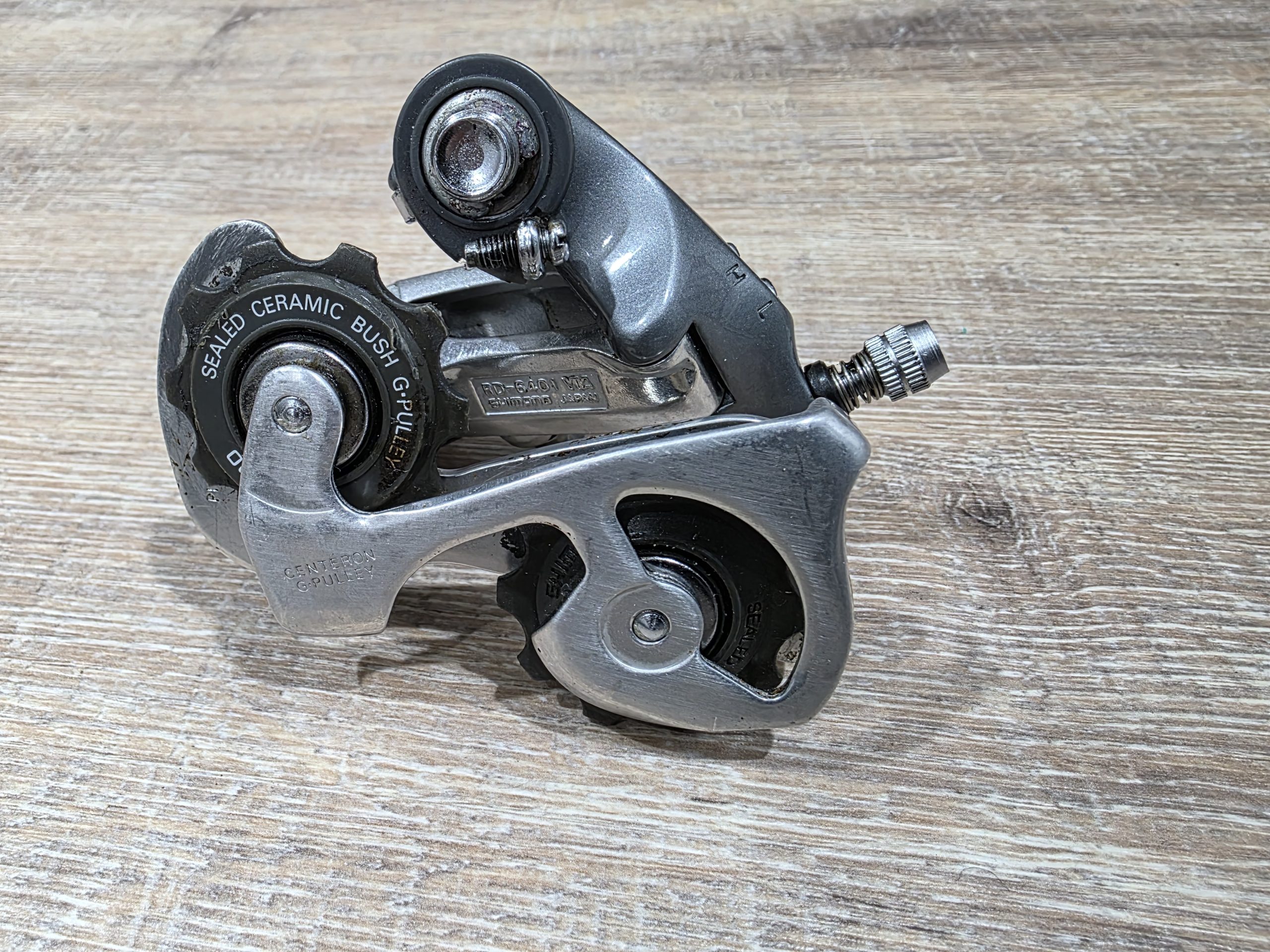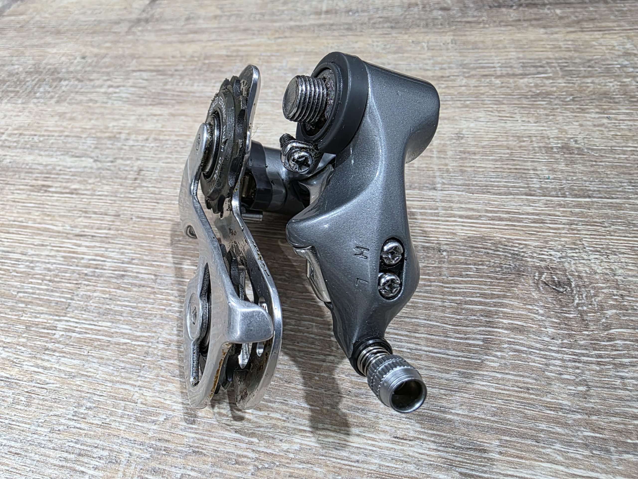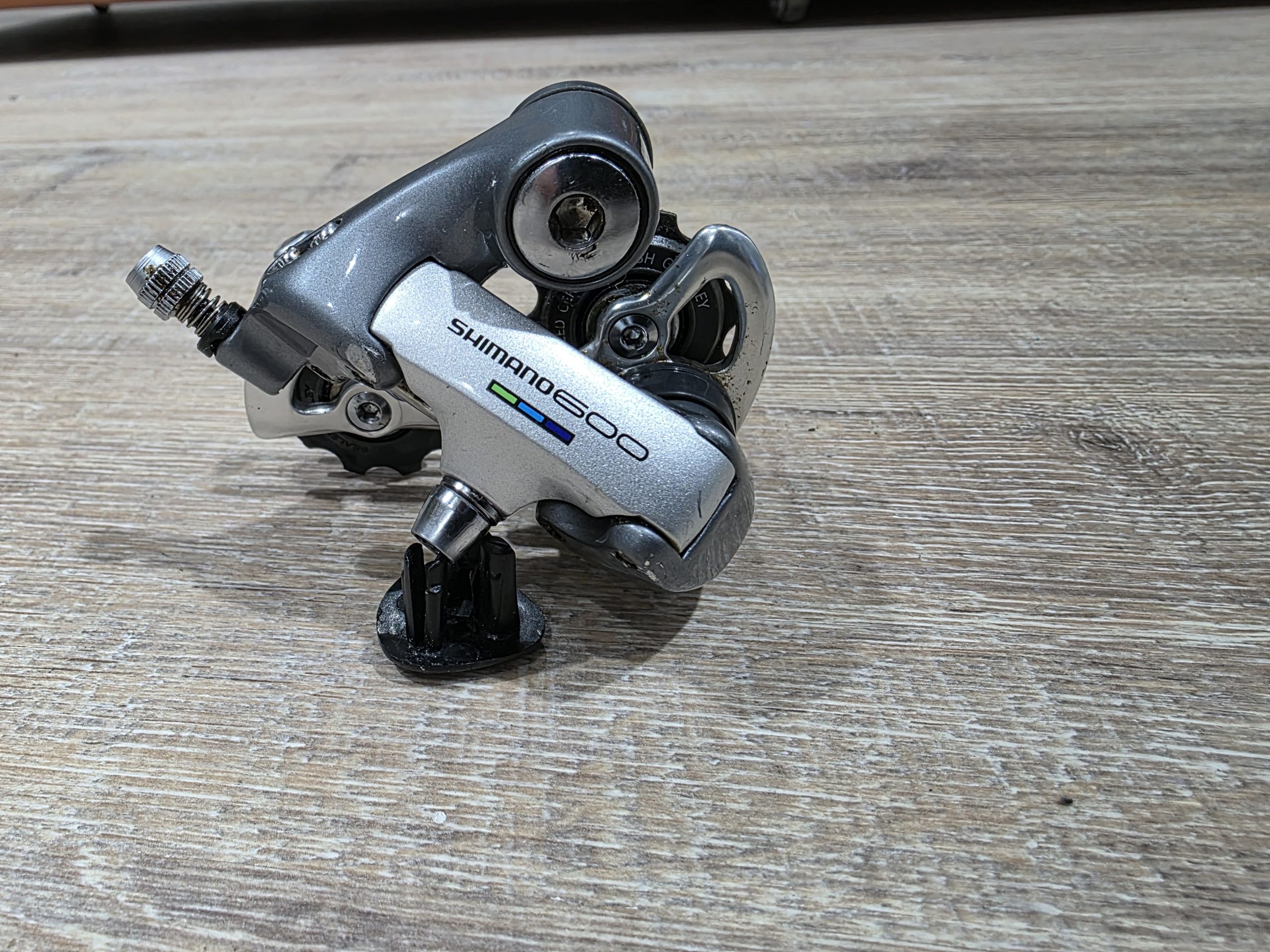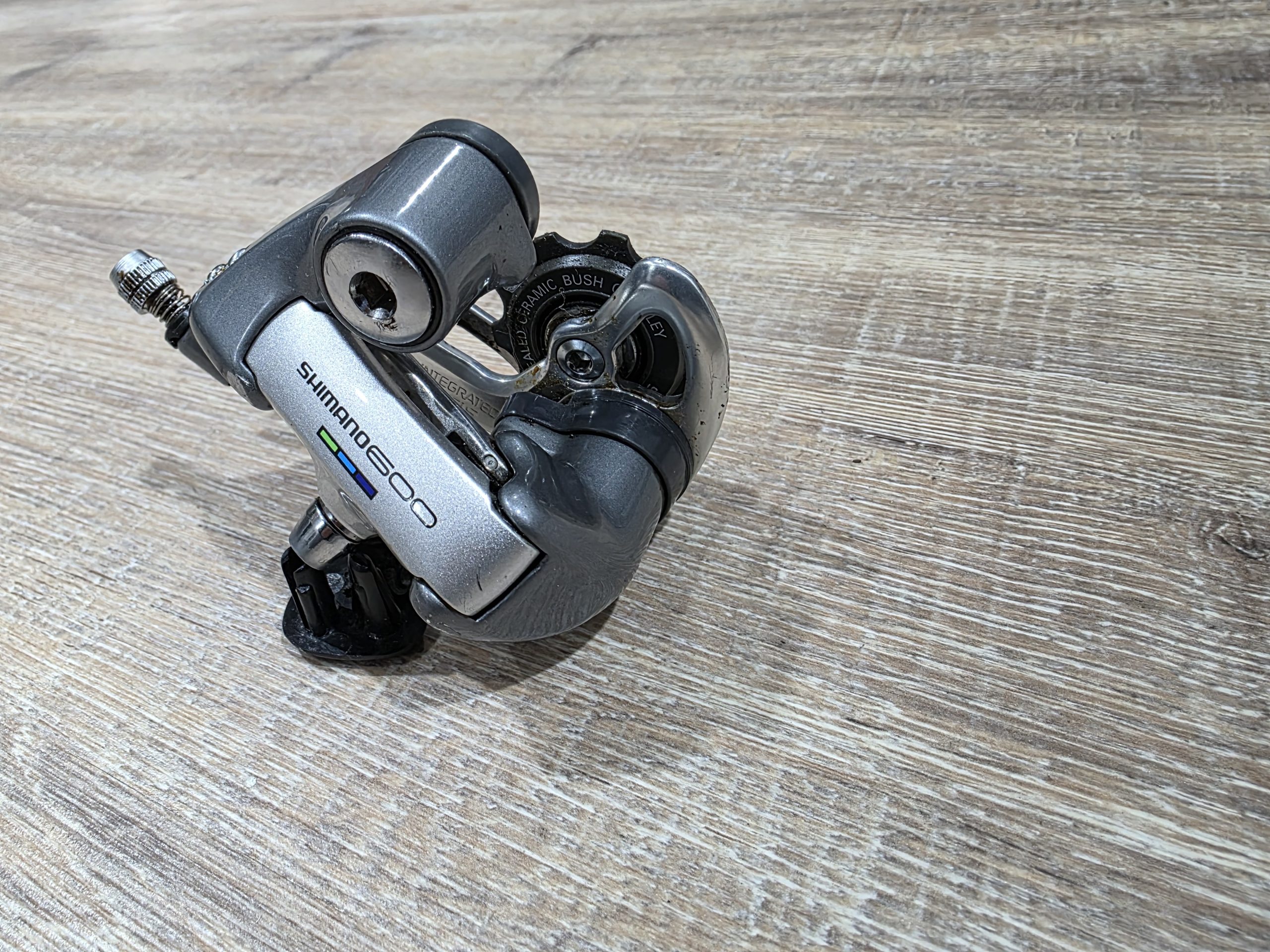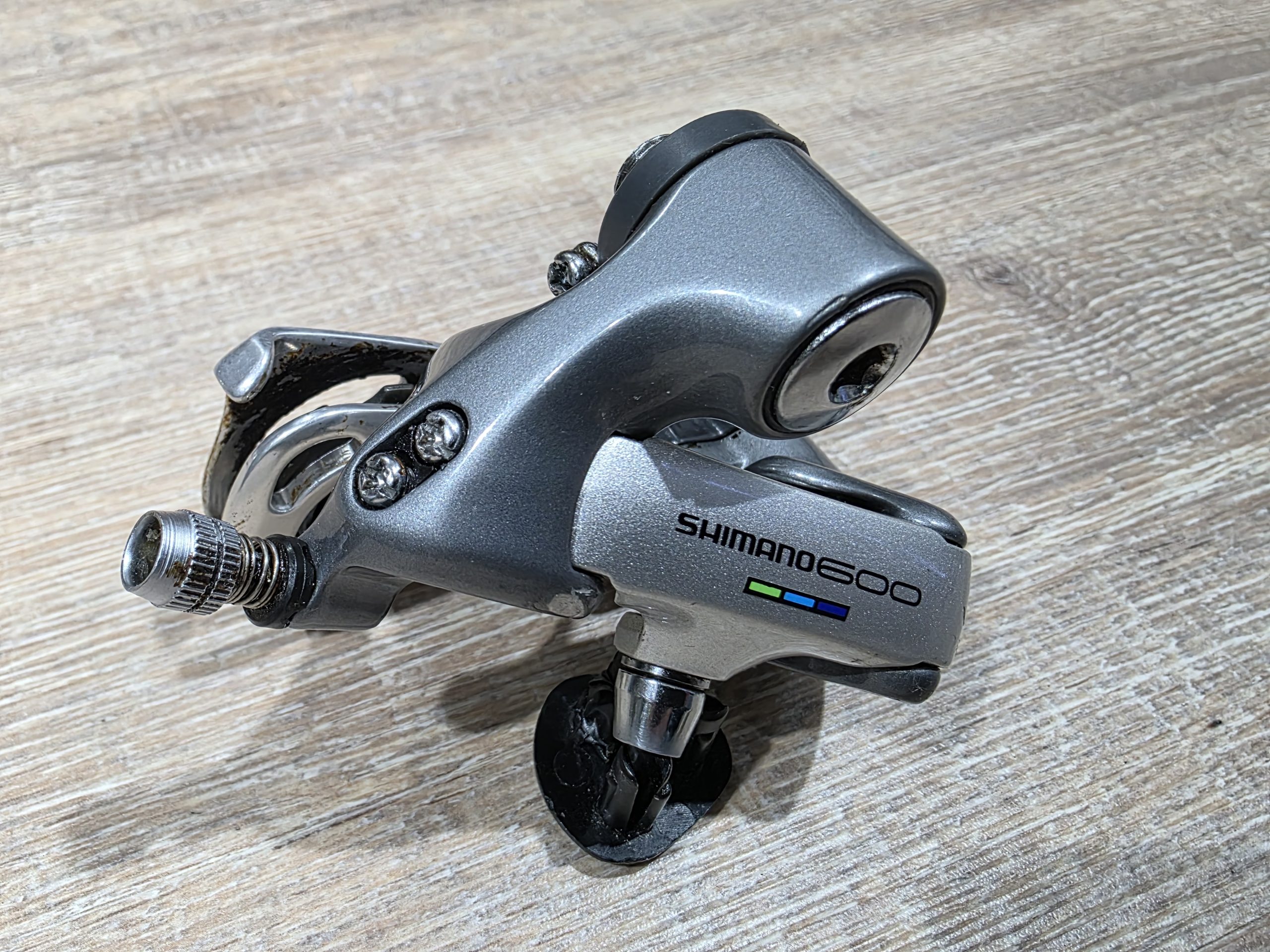Zu verkaufen ist ein gut erhaltenes Schaltwerk aus der Shimano 600 Ultegra Gruppe. Auch bekannt als Tricolor Gruppe.